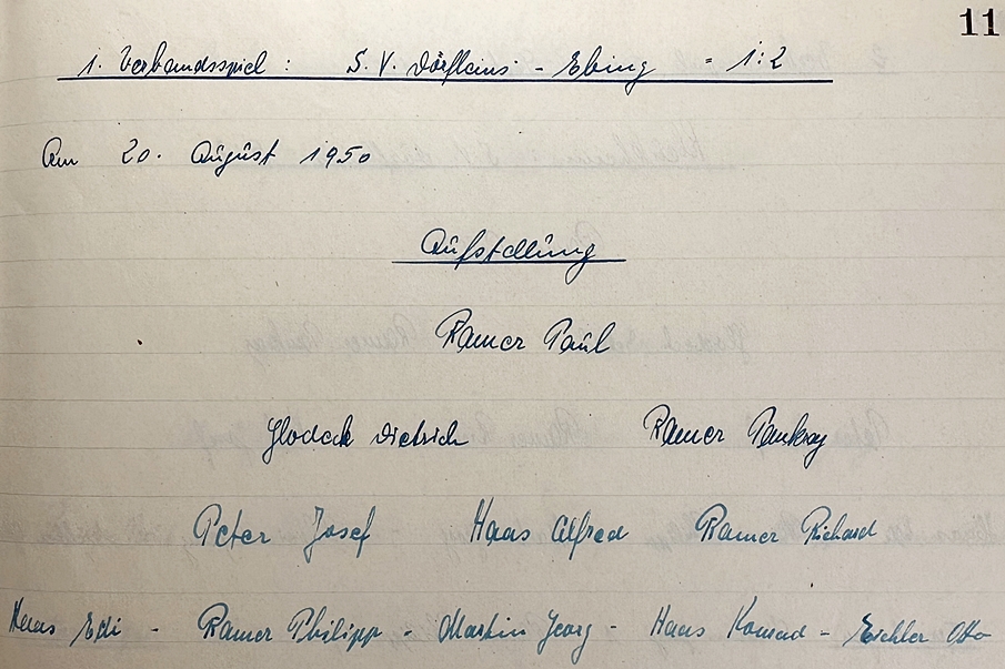 Um 15:00 Uhr war es an jenem Tag so weit und die ersten neunzig Pflichtspielminuten für den noch jungen Dörfleinser Sportverein hatten begonnen. Der jüngste Spieler, Paul Ramer, stand zwischen den Pfosten. Mit Pankraz, Richard und Philipp standen noch drei weitere Ramers im allerersten Aufgebot. Hinzu kommen Alfred, Eduard und Konrad Haas sowie Otto Eichler, Dietrich Glodeck und Georg Martin. Der Elfte im Bunde war Josef Peter, dem gegen Ebing das allererste Tor der Vereinsgeschichte gelingen sollte. Zwar verlor der SV Dörfleins sein Auftaktspiel an diesem Nachmittag knapp mit 1:2, dennoch aber war dieser 20. August ein weiterer großer Tag für die Vereinshistorie, denn gleich im ersten Pflichtspiel auf heimischem Grund war der erste grün-weiße Treffer gefallen.