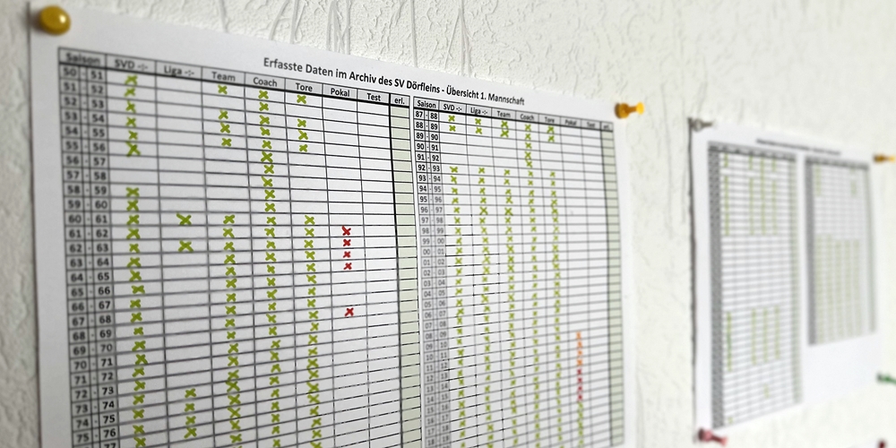 Am 15. März 2023, also vor exakt einem Jahr, hat die umfassende Archivarbeit begonnen. Geschichtsträchtige Ereignisse wurden dabei zunächst in eine Art Zeitstrahl einsortiert, erste Endergebnisse, Tabellen, Spielaufstellungen und Tore in ein eigenes Programm eingegeben. Inzwischen konnten in etwa 450 Arbeitsstunden über 4.500 absolvierte Pflichtspiele sämtlicher Dörfleinser Mannschaften gesammelt und archiviert werden. Von den dabei rund 12.200 erzielten Toren sind etwa 11.200 Torschützen bekannt. Rund drei Viertel aller SVD-Pflichtspiele der vergangenen 75 Jahre sind inzwischen digital erfasst.